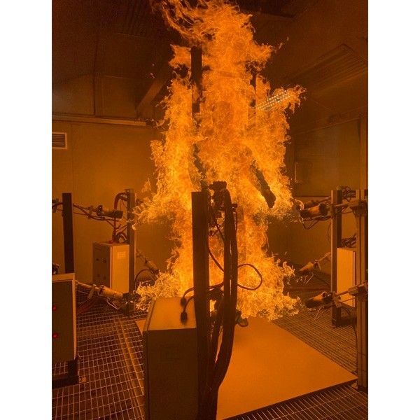 燃烧假人(热人仪)测试法采用将假人放置于模拟热流量、燃烧时间和火焰分布均可控的火场环境,预测人体皮肤达到二度和三度烧伤的部位及程度(烧伤比例、总热烧伤能量),从而评估服装的整体热防护性能。其最大的特点就是可以快速、精准、可重复性地模拟闪火条件下人体与服装、环境的热交换。实验中,将穿着防火服的燃烧假人置于实验室模拟的燃烧环境中,并暴露一定时间,通过假人身上分布的124个热传感器测量和计算透过被测服装传导到人体表面各部位的热量和温度,预测人体烧伤的情况,评价服装的热防护性能,实验前,通过标定使得平均热流达到标准所规定的84KW/m2,通过视频记录燃烧过程,观察燃烧过程中服装的实时变化-着装燃烧测试场景。