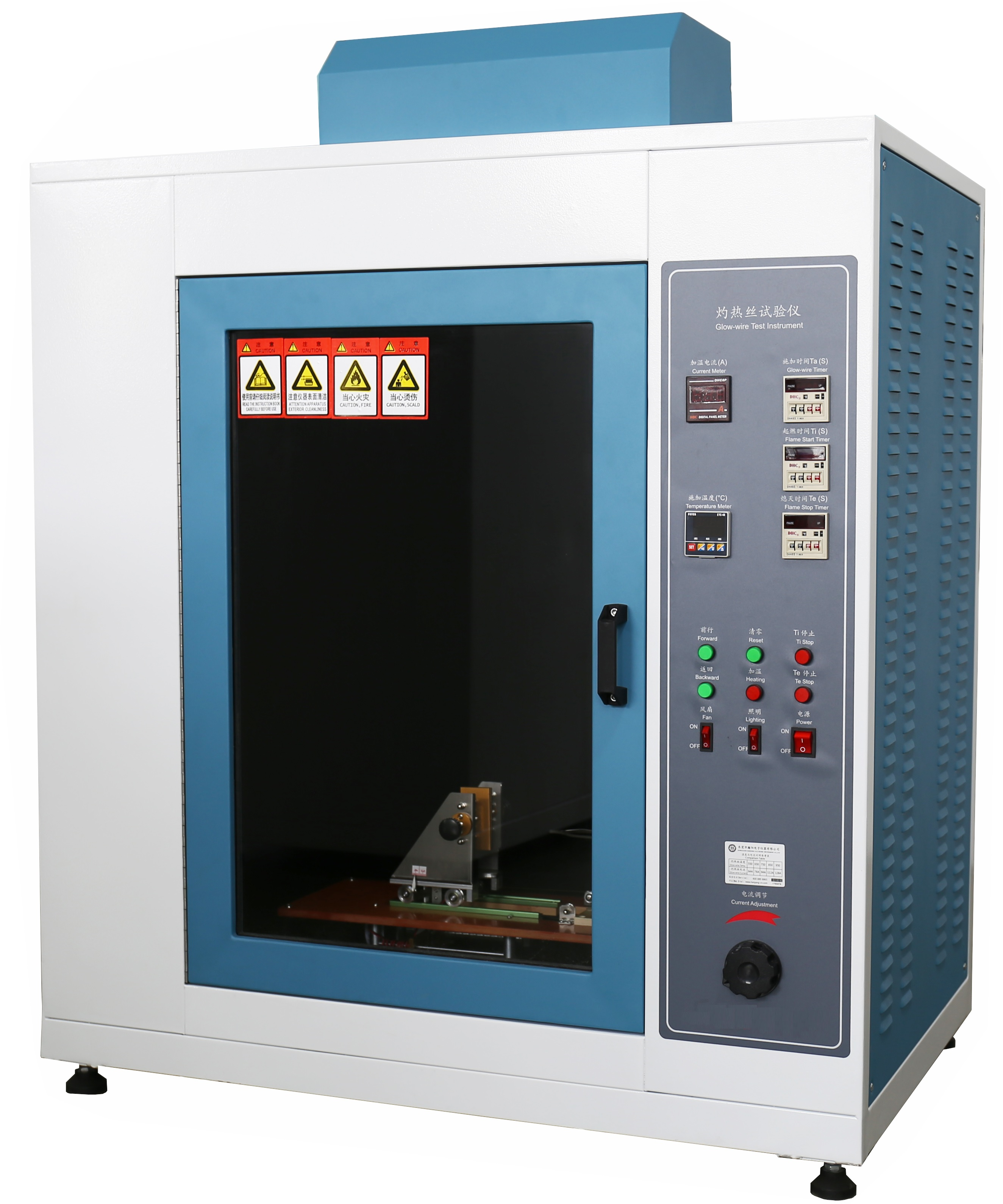 1 特点:控制系统自动化,启动后装夹试样的小车会自动将试样运行到灼热丝处,到达设定的灼热时间后会自动返回,内部为黑色背景,带有抽风和照明装置,时间、温度数字显示,观察记录方便